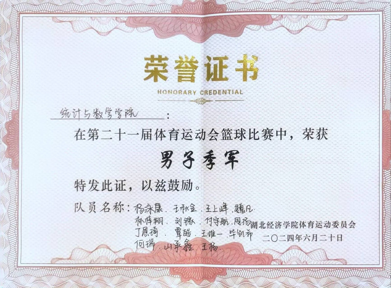 统数学院的学子们以满怀青春的活力与坚持不懈的斗志,展现了学院的团结协作精神和积极向上的精神风貌。他们凭借默契配合与精妙战术,将每一场赛事转变为展示我院风采的盛宴。在激烈的竞争中,我院篮球队最终荣获季军,这一成就不仅是对他们辛勤训练和比赛的肯定,更是对我院体育精神和竞技水平的的高度认可。