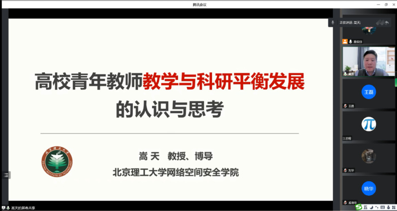 嵩天教授指出,人才培养是高等学校的第一任务,教师应该立足于教学,将教学改革贯穿自己教学的始终,从发展教学中获得职业的满足感和成就感;同时,在科研上,一定要跟着国际前沿走,立足基础研究,兼顾应用研究,不断提升自己的科研能力。这也是青年教师在高校发展的核心能力和标志。