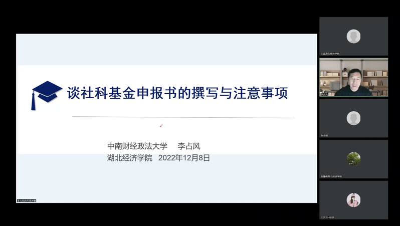 为提升我院国家社科基金申报项目质量、提高申报立项率,12月8日,学院邀请国家社科基金评审专家、中南财经政法大学太阳集团tyc33455李占风教授,通过线上会议的方式作了《社科基金申报书的撰写与注意事项》专题讲座。讲座由王磊副院长主持,张耀峰院长致欢迎辞,我院教师30余人线上参与本次讲座。