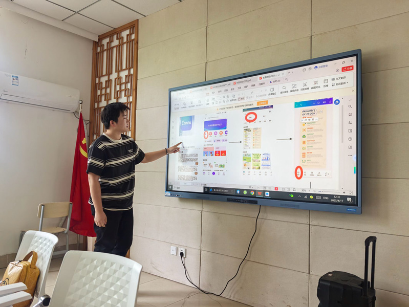 权益部干事马晗欣详细讲解了长图制作的具体步骤。他通过屏幕展示设计软件界面,逐一说明模板选择-内容排版-重点标注-导出保存的操作流程,特别强调红色标注的使用规范和信息分层的注意事项。制作时要突出权益反馈的关键节点,确保信息传达清晰。马晗欣边讲解边指示屏幕上的操作要点,委员们认真记录每个步骤。