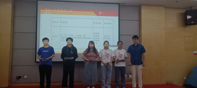 活动开始,张耀峰院长致辞。他指出比赛秉持“开放、共享、交叉、合作”的原则,面向全校召集指导老师,面向全校选拔参赛学生,按竞赛进度组织教师培训和学生培训,充分体现了学科交叉、学科融合对全校高质量人才培养的支撑作用,希望获奖同学能够再接再厉,不断提高自己的专业水平和实践能力,在今后的比赛中再创佳绩。接着国家一等奖获奖团队进行作品展示并由团队成员冉凤婷作参赛经验分享,现场师生反响热烈。最后张耀峰院长、曾菡副处长、周文副院长分别为获得国家一等奖、国家三等奖和湖北省一等奖的团队颁奖,张志刚副院长为优秀指导老师颁奖,王磊副院长和夏伦主任分别为获得网络人气投票第一名、第二名的团队颁发奖品。活动结束后,参会嘉宾、获奖团队与工作人员进行合影留念。