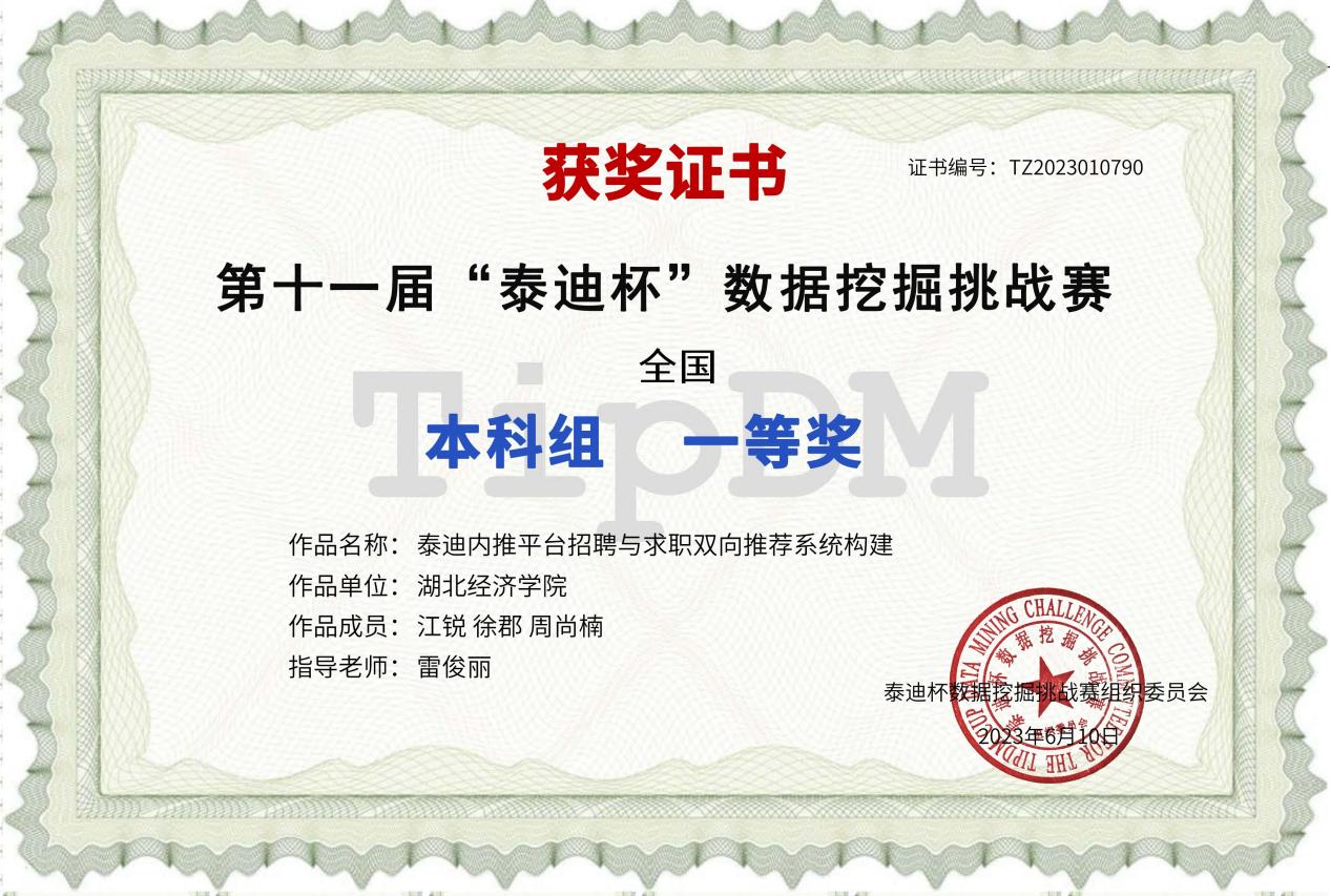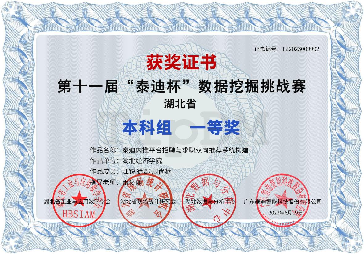 日前,2023年全国高校数据科学实践教学研讨暨第十一届“泰迪杯”数据挖掘挑战赛颁奖会在广东惠州隆重举行,由我院数据科学与大数据技术专业学生徐郡、周尚楠、江锐组成的参赛队伍脱颖而出,获得本届“泰迪杯”全国一等奖(全国3811支队伍仅50支本科生队伍可获一等奖)。此外,我校还获得全国二等奖2项、三等奖5项,湖北省一等奖1项,二等奖3项,三等奖6项,我校获得“最佳组织奖”。指导教师为张耀峰、张志刚、王磊、雷俊丽、胡凡、李明磊、沈卉卉、徐旭、王东红等。