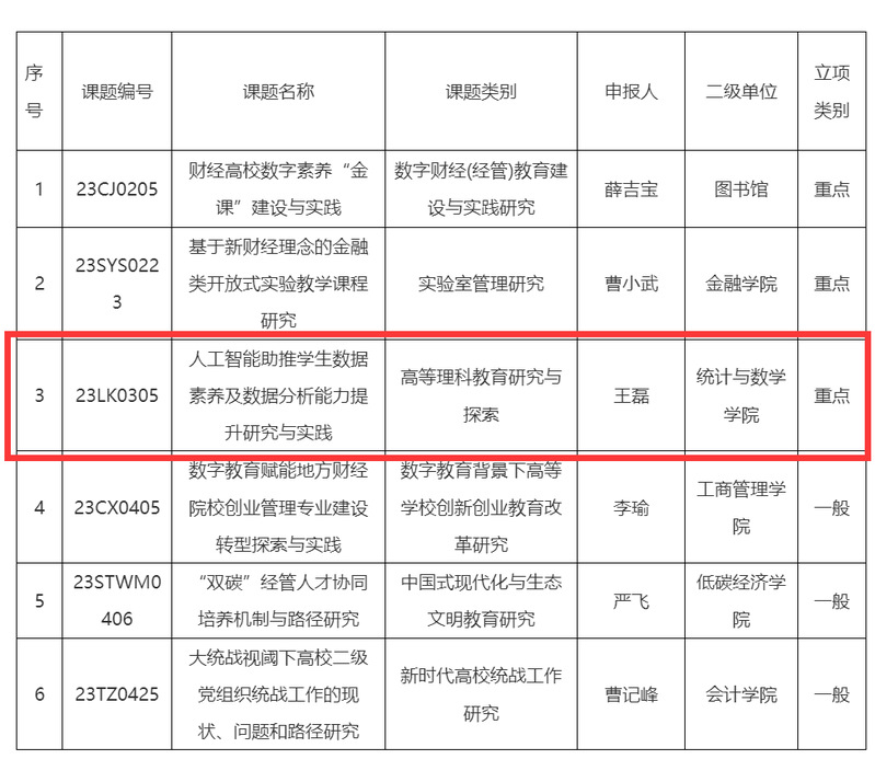 (通讯员:史高超,审稿人:王磊)近日,中国高等教育学会公布“2023年度高等教育太阳集团规划课题”立项名单,我院王磊副教授申报的“人工智能助推学生数据素养及数据分析能力提升研究与实践”获重点项目立项。